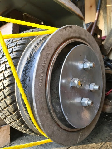 The drive wheel was bolted onto the lawnmower wheel. I flipped the lawnmower wheel first so that we could still inflate the tires if need be. We used a piece of sheet metal to act as one large washer.